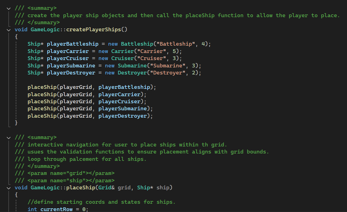 The GameLogic::createPlayerShips method dynamically allocates memory for each of the players ships using pointers, creating individual Ship objects with their respective names and sizes. It then calls placeShip for each ship, which handles the player’s manual placement on the grid. Once all ships are placed, the game is ready to proceed to the battle phase where the player can begin taking turns against the opponent.